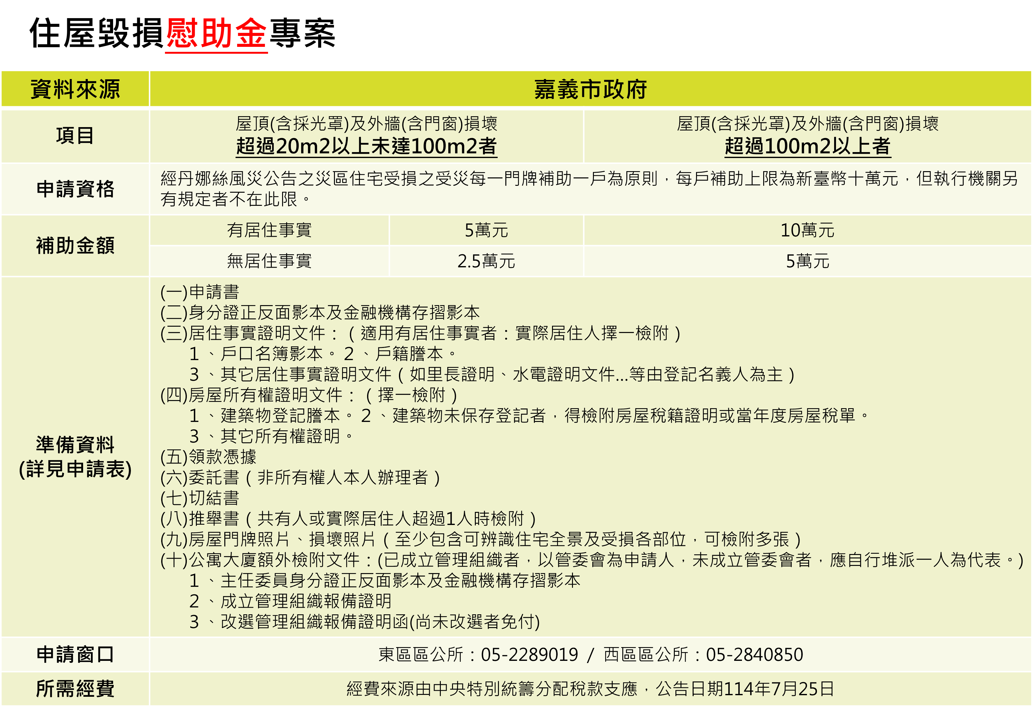 因應丹娜絲颱風帶來的強風豪雨,造成嘉義市多處住宅受損,嘉義市政府於114年7月25日公告「丹娜絲風災住屋毀損慰助金專案」,協助災民儘速復原家園。申請人須備妥身分證明文件、房屋所有權文件、災損照片及切結書等相關紙本資料向各區公所或聯合里辦公處申請。