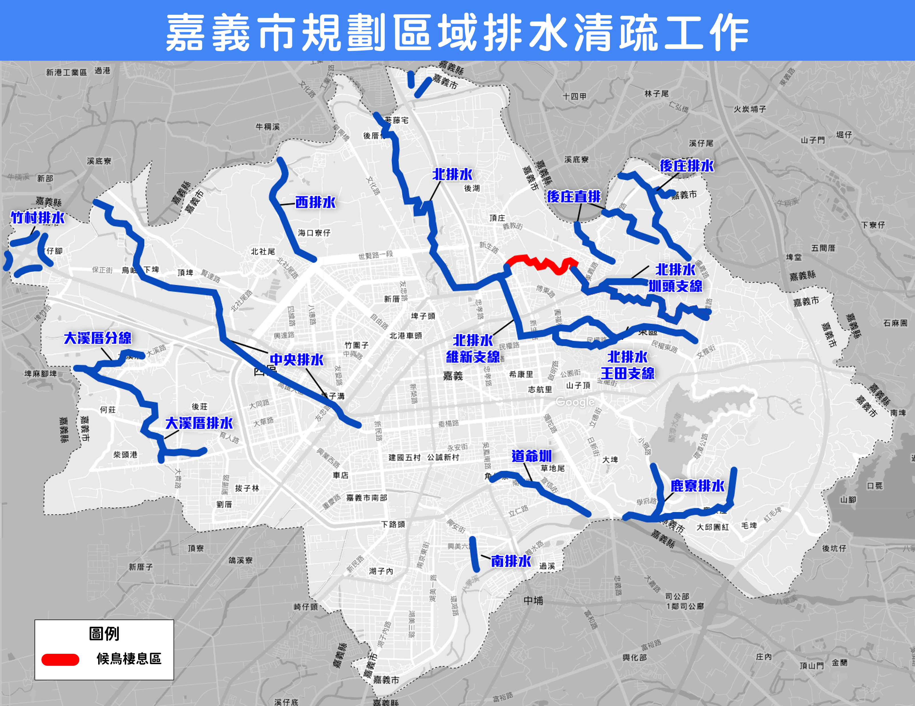 另外市府在守護市民安全的同時也兼顧自然生態,針對北排水(新生路至義教西路段)候鳥棲息區,將特別安排於候鳥離巢後再辦理清疏作業。