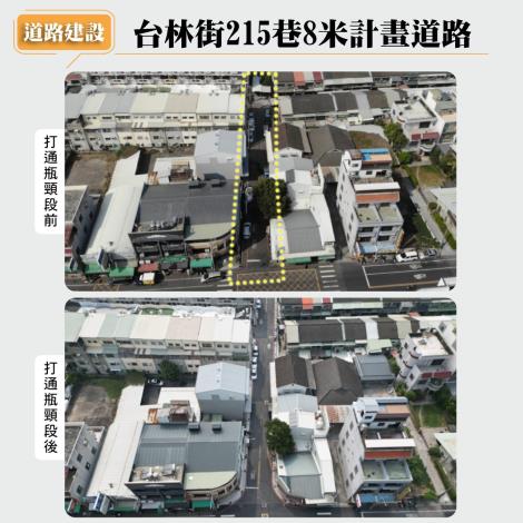 本計畫道路將舊有台林街215巷通往義教街731巷之瓶頸段打通,將有助於巷道人車通行更順暢、便利,道路開闢後配置雙向車道,並改善排水側溝及新設照明路燈,同時協調台電公司進行電桿下地,讓通行空間順暢、美化市容景觀,更能避免颱風侵襲、造成纜線脫落或電桿折斷,保障民眾的安全,感謝沿線市民配合開路需要拆遷及修繕建物,讓市府團隊能順利推動建設,市府將持續優化人本交通環境、構成完善的住宅區服務,提升附近居民整體生活品質。