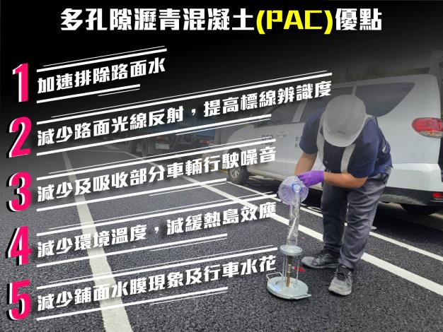 此次路面改善 #試辦使用多孔隙瀝青混凝土(PAC)材料,與一般瀝青混凝土(AC)材料相比較具下列優點: